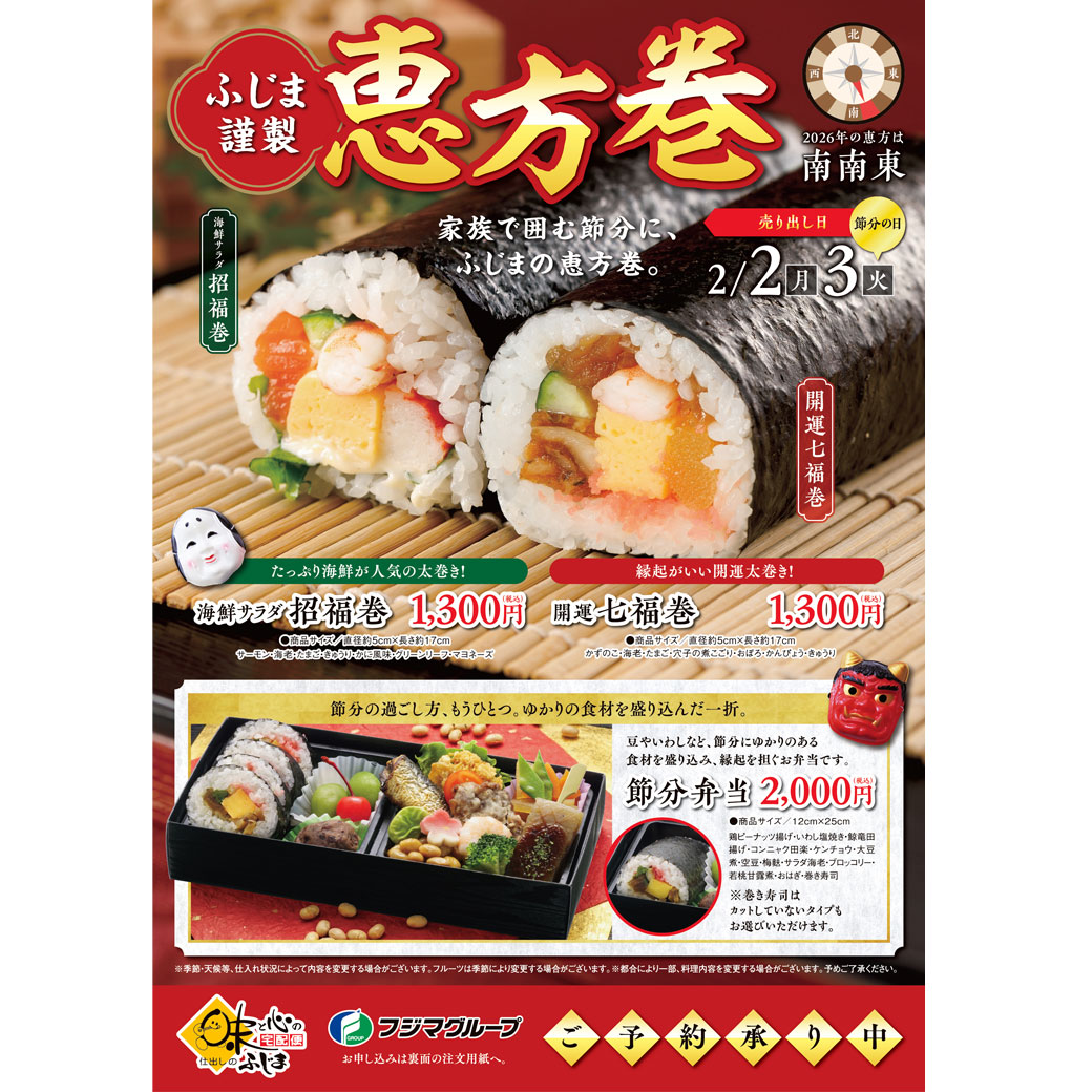 「仕出しのふじま」では節分弁当と恵方巻のご予約を承り中です。