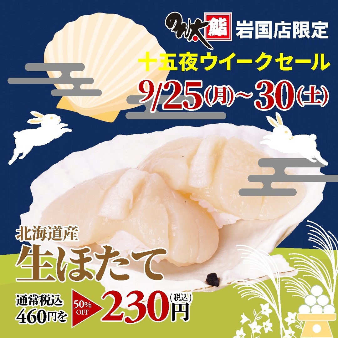 🍣のん太鮨岩国店では本日9月25日(月)から30日(土)まで、「北海道産生ほたて」通常税込460円を半額の税込230円で販売します。※店内でのお召し上がりに限ります。