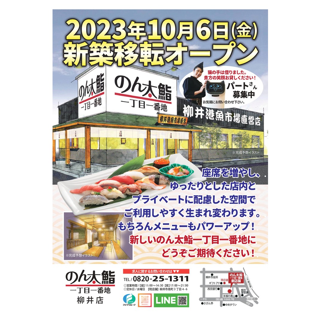 お待たせしました!のん太鮨一丁目一番地柳井店は明日10月6日(金)11時新築移転オープンいたします!※明日お受け渡し分からの、お持ち帰り鮨のネットご注文受付は今夕再開いたしました。